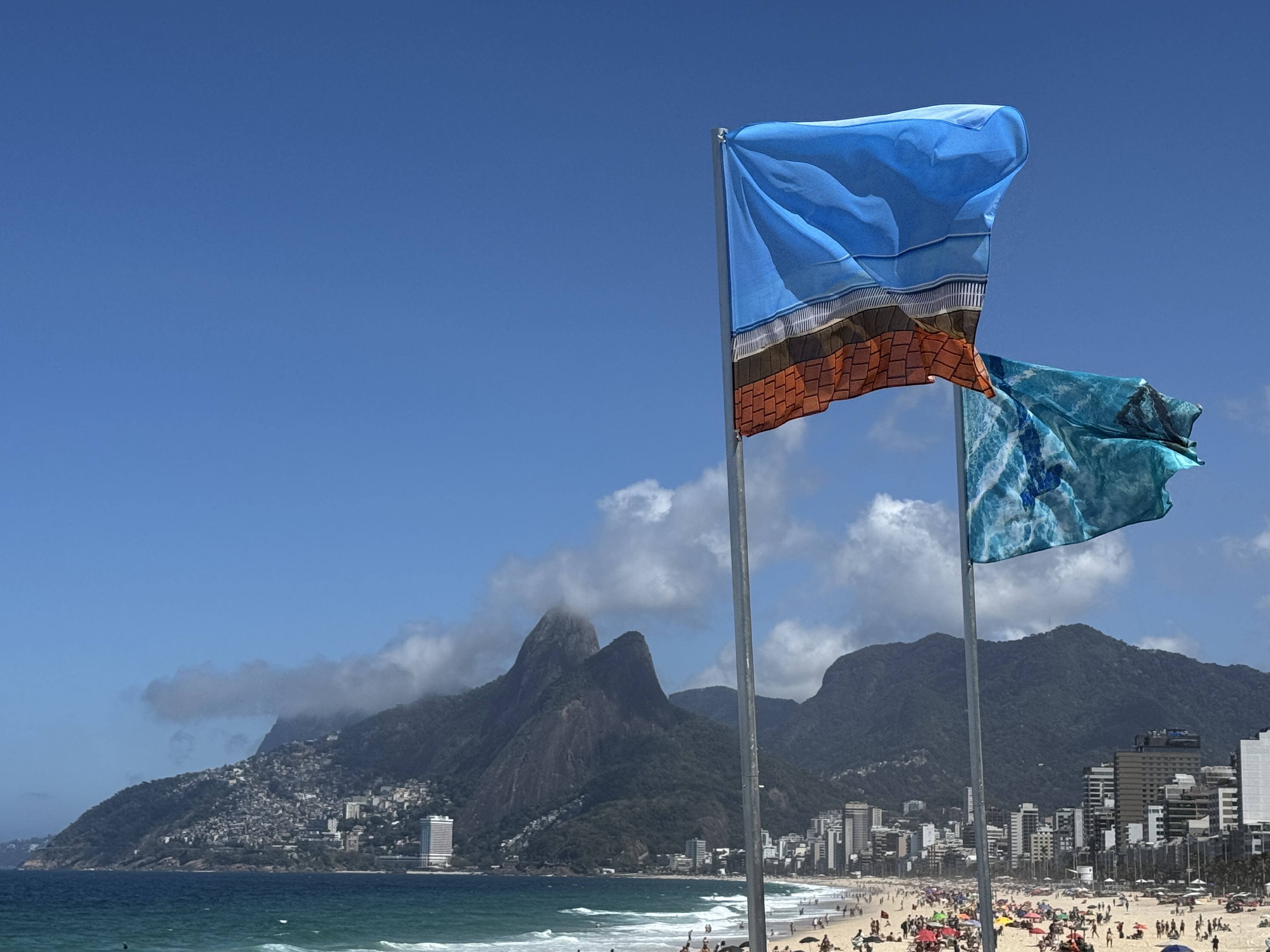 São duas bandeiras translúcidas da série “Piscinas”, que dançam ao vento e transforma referências líquidas em metáforas de fluidez e contemplação. “No clima tropical do Rio, a luz, o vento e o mar intensificam a experiência, criando uma presença viva e poética que convida à introspecção”, diz Maritza.