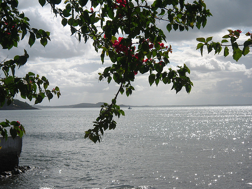Sob a sombra das amendoeiras, apreciar a vista do mar verde claro que se perde no horizonte não custa nada.