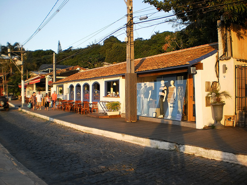 A rua de pedras separa o calçadão, com seus bancos e jardins, dos restaurantes, sorveterias e lojas.