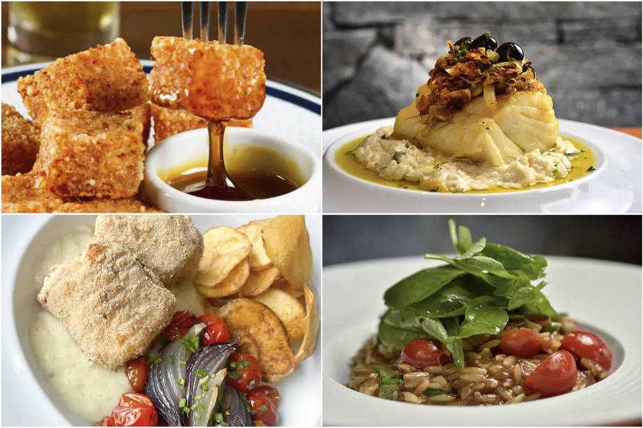 O dadinho de tapioca com chouriço português e melado (R$ 32,00, doze unidades) e o bacalhau filho da mãe, confitado no azeite com arroz cremoso de abobrinha, parmesão e cebola ao curry (R$ 154,00) dividem espaço com versões típicas, nas natas (R$ 98,00), à brás (R$ 98,00), à gomes de sá (R$ 98,00), e arrozes variados — um dos mais pedidos é o de rabada, feito com risoni, tomatinhos e agrião (R$ 59,00).
